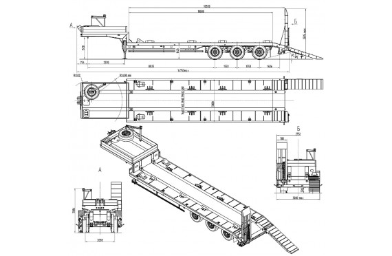 44500 кг, шины 395/85R20 или 445/65R22,5 / 6+1, платформа 12000 (12862 до трапов) x 2530 с уширителями до 3030 мм, ССУ 1510 мм, рессорная или пневматическая подвеска, раздвижные коники, механические трапы с пружиной