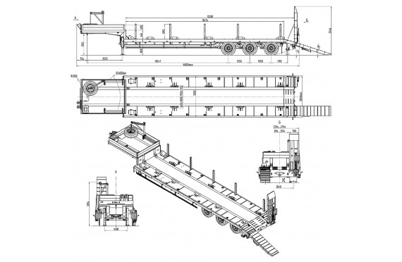 47000 кг, шины 445/65R22.5 или 395/85R20 / 6+1, платформа 9300 (10300 до трапов) x 2500 с уширителями до 3000 мм, механические трапы, пневматическая подвеска, съемные стойки 1500 мм