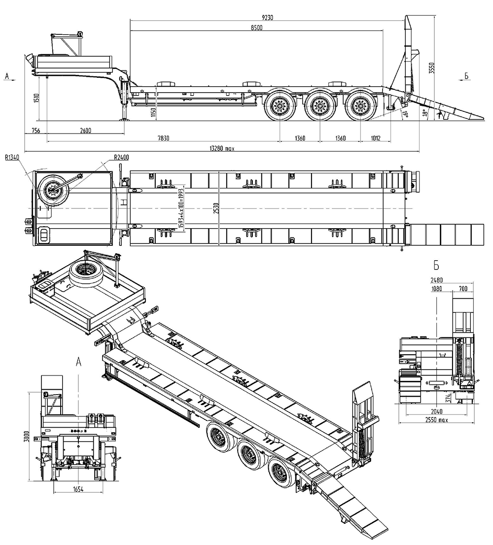 33500 кг, шины 385/65R22,5/6+1, платформа 8500 (9227 до трапов) x 2530 с уширителями до 3030 мм, ССУ 1510 мм, рессорная или пневматическая подвеска, съемные стойки