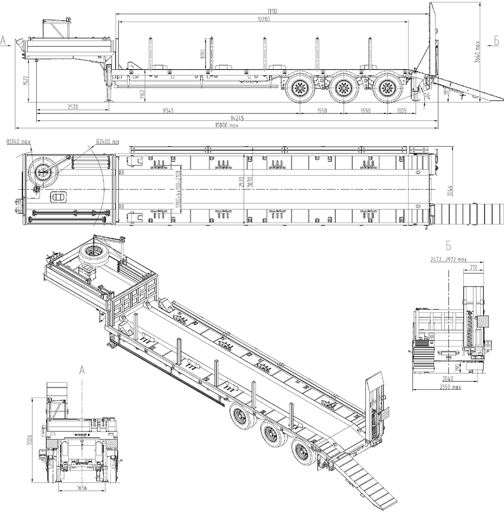 36000 кг, шины 385/65R22,5 или 445/65R22,5 / 6+1, платформа без трапов (12200 x 2500 мм, ССУ 1430 мм, пневматическая подвеска, раздвижные коники 1500 мм, съемные борта или без них, с приставными алюминиевыми трапами, с уширителями) в ГАБАРИТЕ по ДЛИНЕ АВТОПОЕЗДА с КАМАЗ 6x6