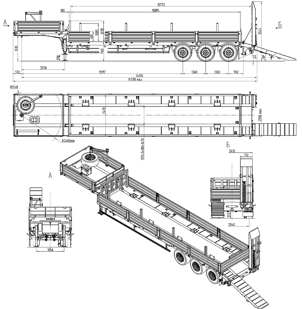 39000 кг, шины 385/65R22,5 или 445/65R22,5/ 6+1, платформа 11461 по трапам) x 2500 с уширителями до 3000 мм, треугольные аппарели, ССУ 1430 мм, пневматическая подвеска, съемные стойки 1500 мм
