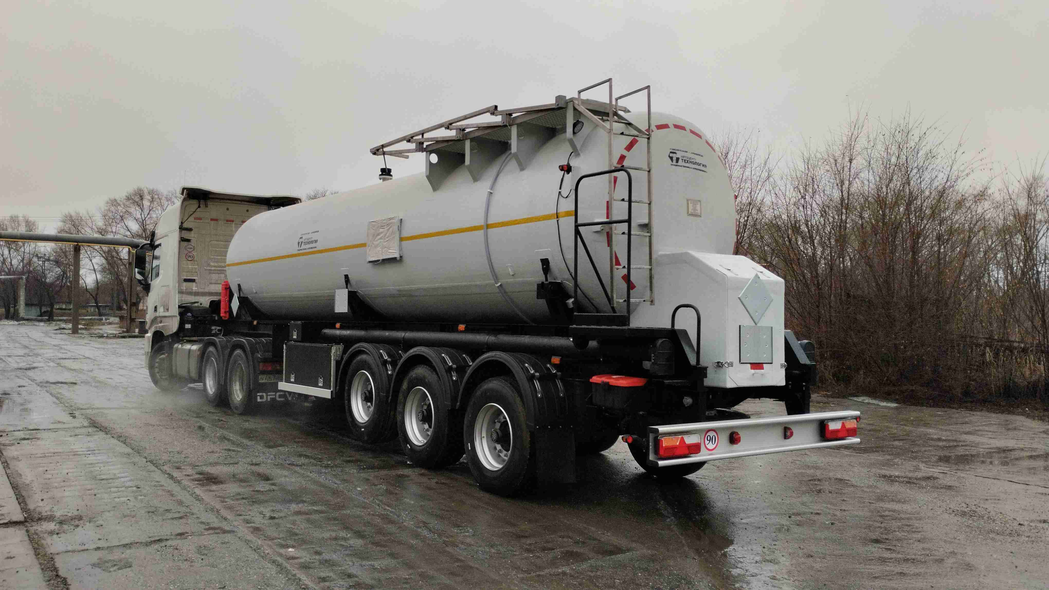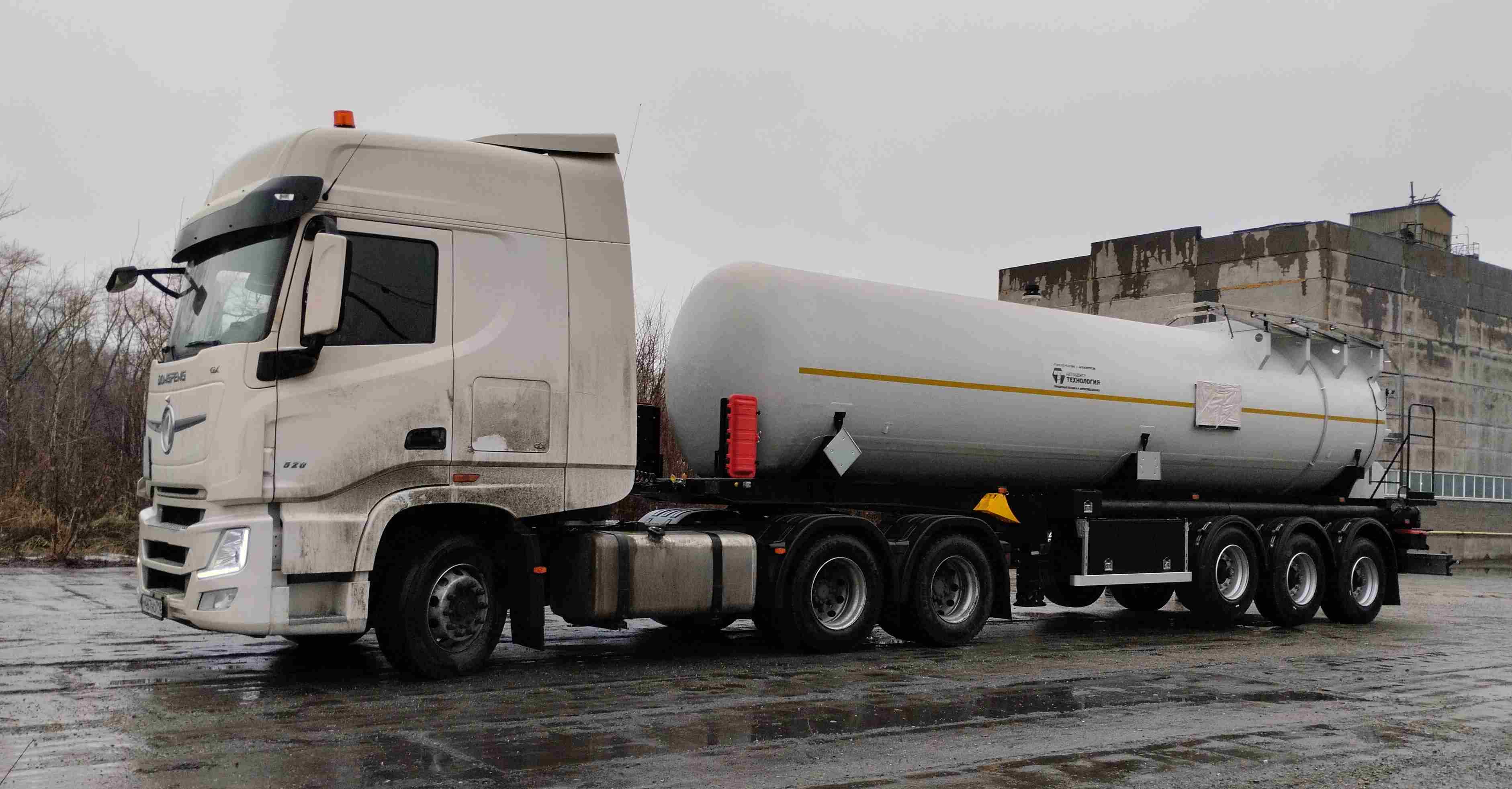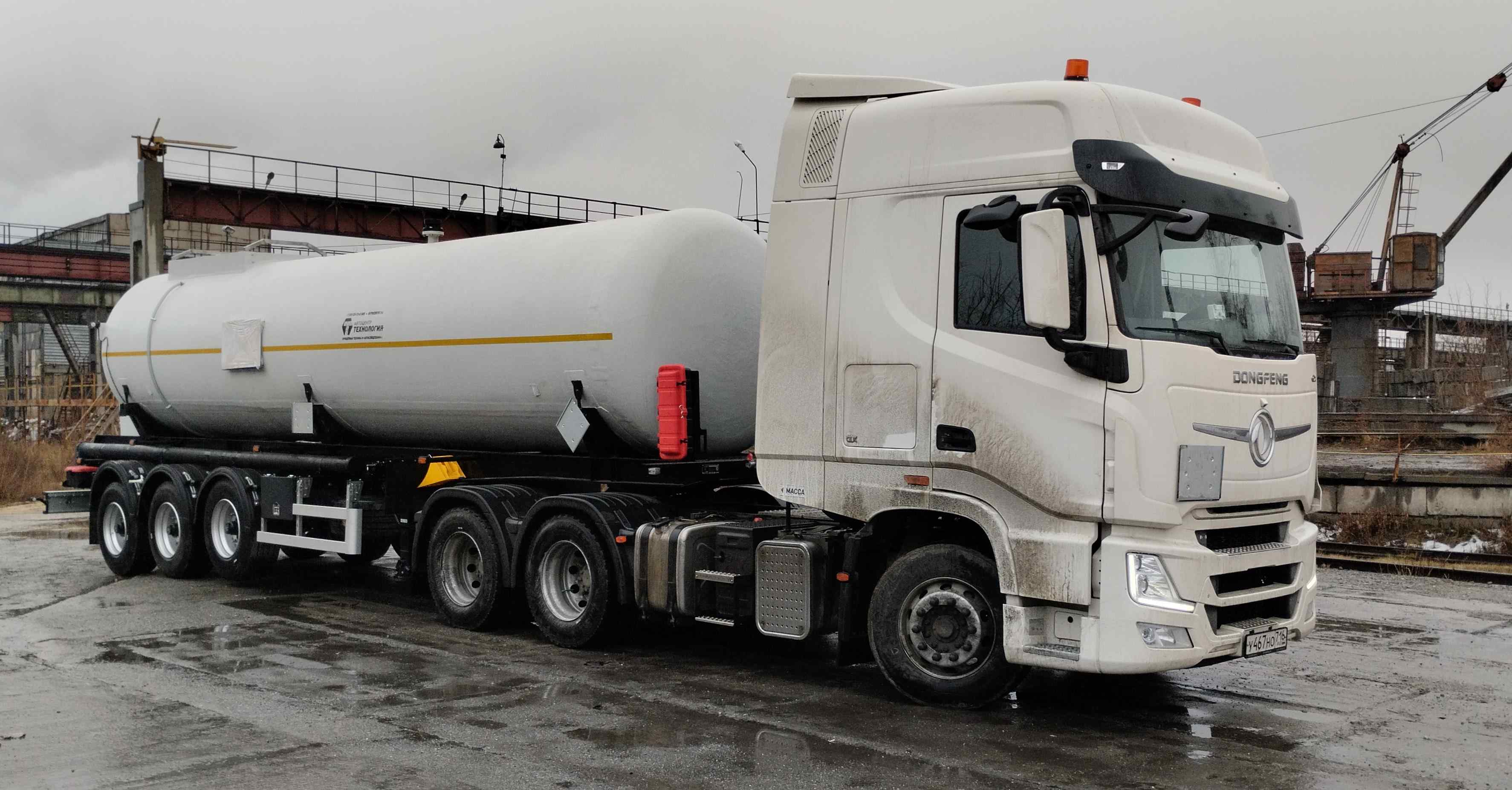 Материал: химстойкое стекловолокно, емкость: 30 куб.м., сечение круглое, конструкция: однослойная или трехслойная (текловолокно + утеплитель + стекловолокно), крепление: при помощи стяжных лент, перевозимые жидкости: нефть, автошины 385/65R22,5; первая ось - подъемная.